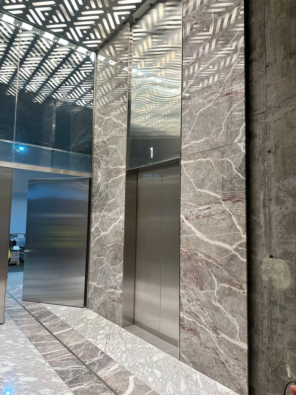 Изготовили и установили современную офисную стойку с подсветкой, сочетающую камень, металл и дерево, для офисного здания компании Alcon на Соколе.